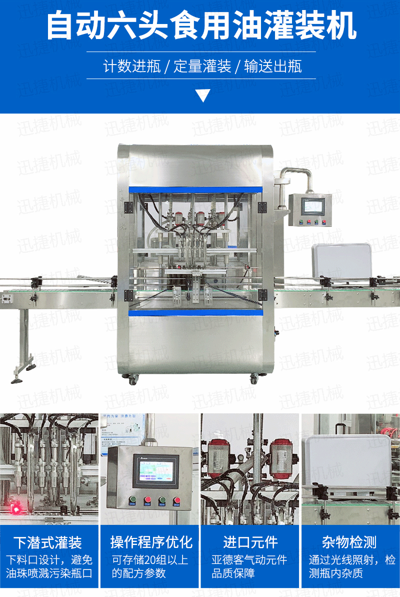 該系列灌裝機采用伺服柱塞式計量灌裝原理,適用于各種規(guī)格(0.1-1升可兼顧到2升灌裝)的南瓜籽油、榛子油、牡丹籽油、芝麻油、核桃油、山茶油、亞麻籽油、棉籽油、橄欖油、大豆油、玉米油、菜籽油等食用油灌裝。設(shè)備采用伺服系統(tǒng)定量推料,在人機界面數(shù)字化調(diào)節(jié)計量,并且可設(shè)定100ml或200ml等所需計量,觸摸屏一觸即達,而且可以單頭微調(diào)計量。操作簡單,維護方便,節(jié)省人工成本,生產(chǎn)效率更高。